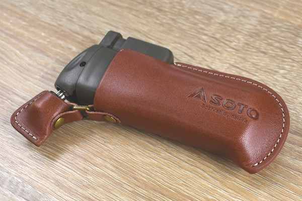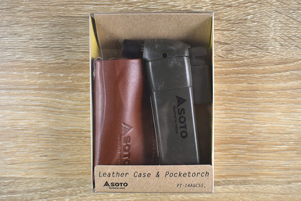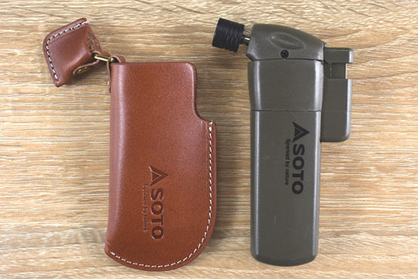 セットのレザーケースは牛革製の本格的な仕様。「ポケトーチ」がスポッと入るだけでなく、火口カバーもついています。最初は少し硬めですが、使い込んで経年変化を楽しむのも良さそうですね。