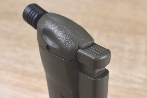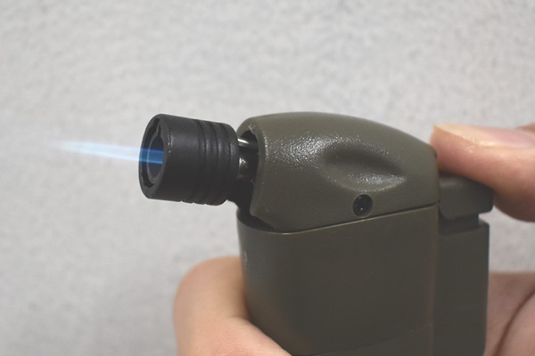 ヘッドについている着火ボタンを押すと、「ゴーッ」という音と共に青い炎が…! 実際に1300度あるかどうかは測れませんが、火力は相当強そうです。外でも着火してみたところ、風で火が消えることもありませんでした。5秒ほど連続で着火したのですが、火口と着火ボタンが離れているため手が熱くならない所もポイント。花火やお線香などへもラクラク着火できそう。