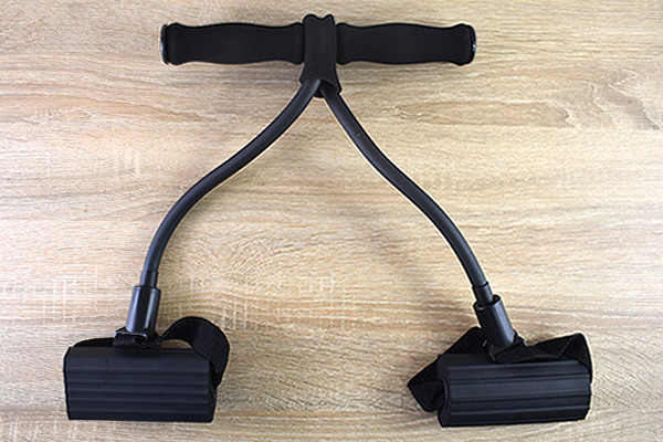 続いて足を伸ばしながら持ち手を引っ張ると、腕と足にそこそこの負荷が。同じ動作を何度も繰り返したところ、徐々に足と腕に力が入らなくなってきます。チューブを引っ張るためにパワーを使いますが、戻ってくる反動も強いため動きを静止するのがなかなかツラいですね…。立ったままできるトレーニングにも対応しているため、ちょっとした空き時間にも運動できるはず。