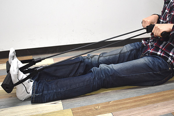 それでは実際に「ボートレ」を使ってボート漕ぎ運動にチャレンジ。まず地面に座って、膝を曲げた状態で2つのペダルに足をセットします。足を乗せる部分は程よく柔らかいため、全力で踏ん張っても痛くありません。
