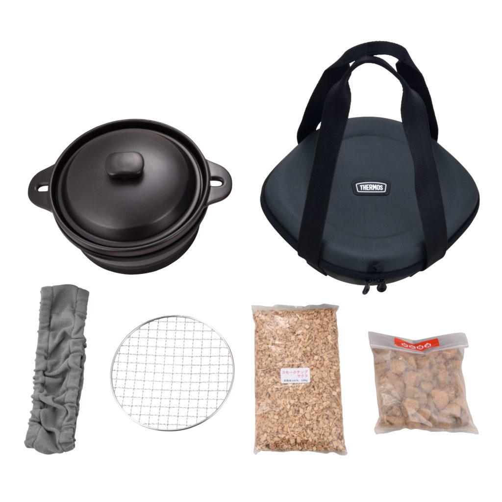 ステンレスボトルと真空断熱カップは、ステンレス製魔法びん構造の高い保温・保冷力が特徴。保温燻製器イージースモーカーには、スモーキングチップ、焼き石、持ち運びしやすい専用バッグが付いています。