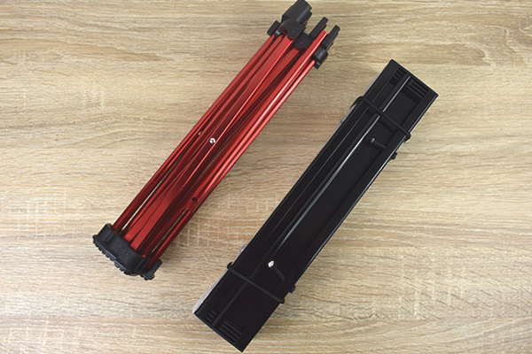 まずは同商品のスペックを確認。テーブルの材質には軽くて頑丈なアルミが使われており、スタンドと天板フレームの2パーツで構成されています。気になる大きさは、2つのパーツを合わせて30(幅)×11(奥行)×6cm(高さ)程度とかなりコンパクト。ちょうど折り畳み傘を2本まとめたようなサイズ感です。