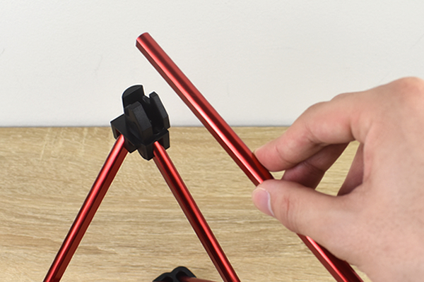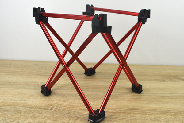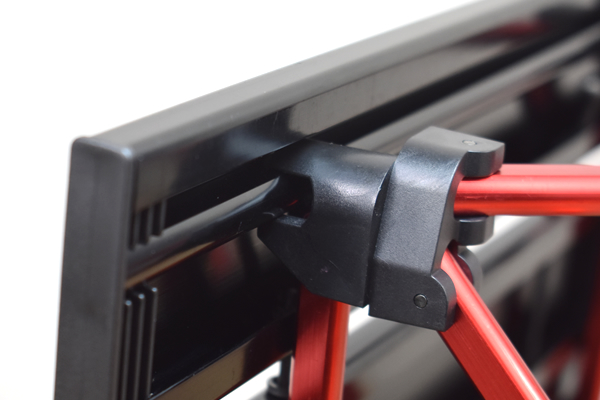 テーブルの組み立て方は至ってシンプルで、まずは脚部になるスタンドを展開しましょう。フレームが軽いのでかなりスムーズに広げることができます。スタンドを広げたら、固定用のバーをストッパーにセットして脚部の準備は完了。
