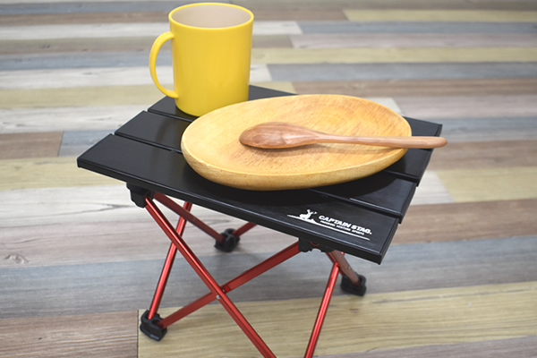 完成したテーブルの高さはおよそ22.5cmほど。試しに1人分の小皿とコップを置いてみたところ、十分快適に使えそうでした。フィッシングなどの地面に座りながら楽しむアクティビティでも重宝すること間違いありません。
