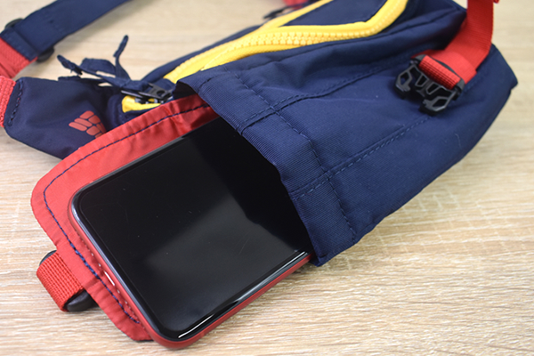 さっそくヒップバッグの使い心地をチェック。“フロントポケット”にスマホを入れてみたところ、サイズにかなりの余裕がありました。これなら大きめのスマホケースを使っていても、「ケースのサイズが大きくて入らない」といった心配はありません。厚みのある生地が中身を守ってくれるので、貴重品用のポケットとしては十分です。