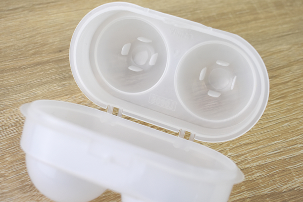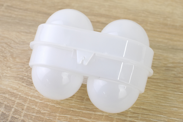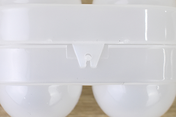ケースは卵2つ分のカプセルがブリッジで繋がっている形状。上下に分かれたケースの底を覗いてみると、片側の底にそれぞれ4つずつ突起がついているのを発見しました。突起は薄い板のような形で、中心に面部分を向けて整列。卵を収めた時は板が卵をそっと受け止めてくれるため、衝撃がきても卵には伝わりづらい仕様になっています。