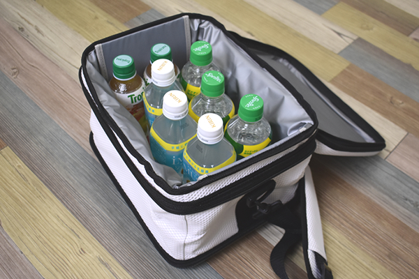 組み立てが終わるとバッグのサイズは30(幅)×25(奥行)×22.5cm(高さ)ほどに。コンパクトな姿から「本当に12Lも入るの?」と不安でしたが、500mlサイズのペットボトルを8本も収納することができました。ショルダーバッグとして持ち運べるサイズなので、女性や子どもでも扱いやすいのがありがたいですね。