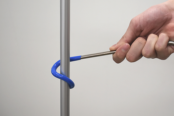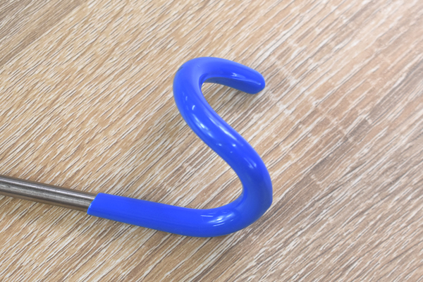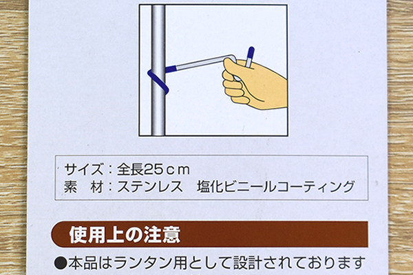 同商品の長さは約25cmほど。螺旋状に設計された固定部分をポールに巻きつけてセッティングします。螺旋状の部分が塩化ビニールでコーティングされているおかげで、ズレ落ちてしまう心配はありません。あとはフック状になっている先端にランタンを吊り下げるだけでOK。