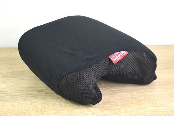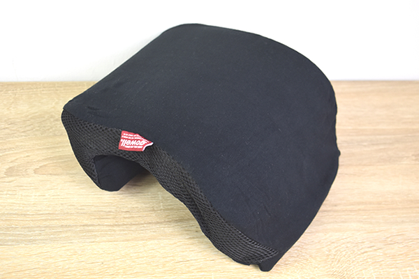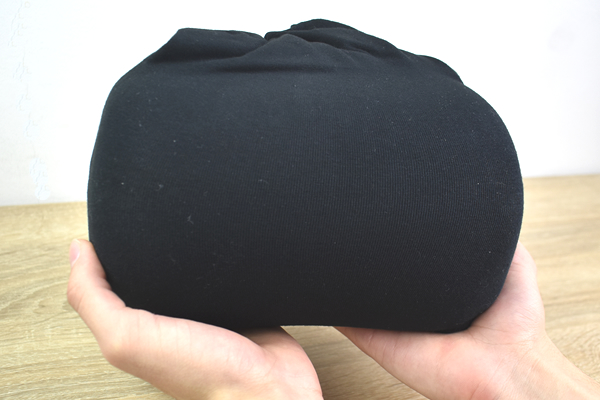 クッションのサイズは約23.5(幅)×12.3(奥行き)×30.0cm(高さ)ほど。アルファベットの“Jの字”のような独特なデザインが特徴です。クッションカバーが“巾着袋”になっているので、クッションを丸めるとコンパクトに収納可能。これなら“マイカー”以外にも、バスや飛行機を利用した移動でも気軽に持ち運べますね。