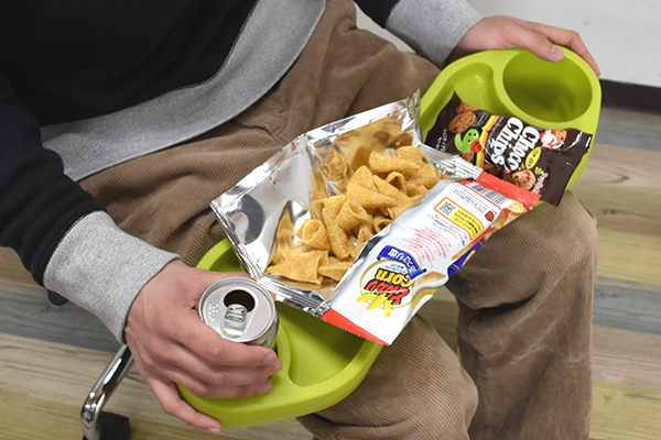 腰かけた状態なら場所を選ばず使用できるので、室内での活用もおススメ。トレーの容量も大きく、一人前の食事なら難なくのせることができます。映画鑑賞の際に使用してみたのですが、まるで映画館のような快適さを体験できました。