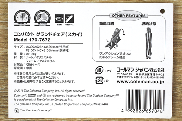 ●ワンアクションで折り畳みできる「コンパクトグランドチェア」(Coleman)