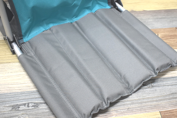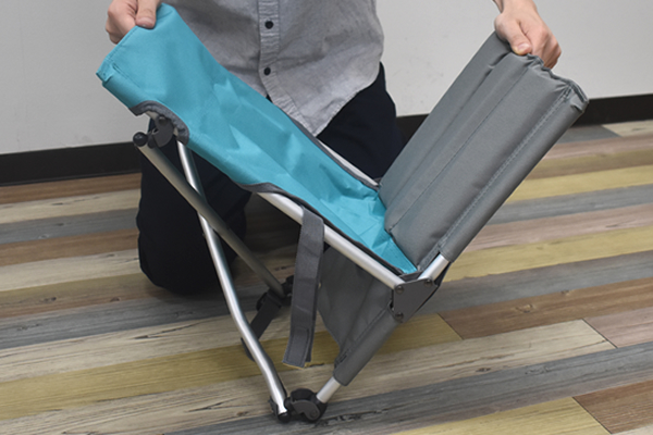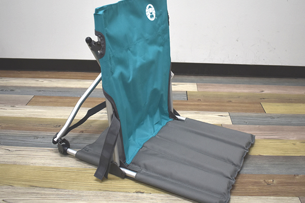 実際に椅子へ腰かけてみたところ、想像以上の快適な座り心地を体感。シートの中にクッションが入っているおかげで、地面の冷たさや硬さを気にせず座ることができました。背もたれには頑丈なアルミフレームが採用されており、体重をかけてもしっかり背中を支えてくれます。一般的な座椅子と比べても遜色のないフロアチェアなので、普段使いにもおススメ。使わない時は“サッ”と畳んでコンパクトに収納しておきましょう。