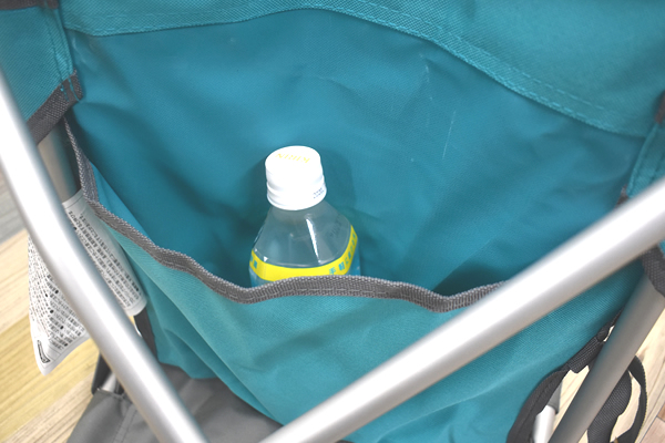 座椅子の組み立て方法は、ボディをホールドしているベルトを外して左右に広げるだけでOK。ネジ止めやフレームの組み立て作業は一切ありません。組み立て時の大きさは約39.0(幅)×52.5(奥行)×43.5cm(高さ)で、よく見ると背もたれの後ろには約30cmのポケットが。ペットボトルや雑誌も余裕で入るサイズ感のため、いろいろなものを収納できます。