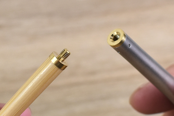 続いてグリップについている“キャップ”を外したら、先端部にセット。後はグリップの中へ挿入すれば、コンパクトに収納できますよ。実際に先端部をグリップに収納してみると、まるで鞘に“刀”を収めているような感覚に…。まさに「和武器 M」というネーミングにふさわしいアイテムです。ちなみにキャップは“四角形”に作られているため、転がる心配もありません。