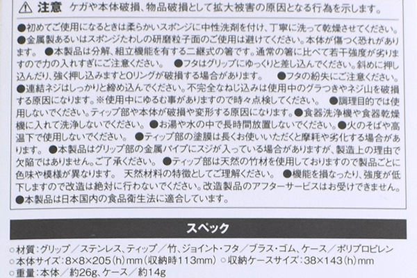 同商品の全長は約8(幅)×8(奥行)×205mm(高さ)で、重量は14gほどです。グリップの部分はステンレスで作られており、お箸の先端部は自然に優しい“竹”を採用。ずっしりとした重みを感じるため、かなり高級感があります。