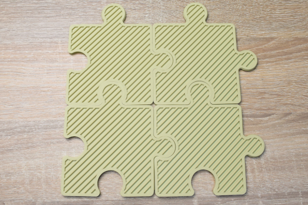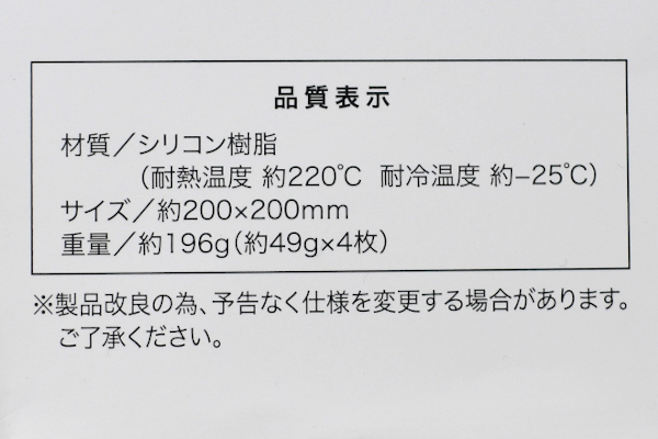 さっそくパッケージを開けてみると、中から“パズル形”の鍋敷きが登場。4枚のピースが連結された状態は、200(縦)×200mm(横)ほどの大きさです。使用する際は鍋底のサイズに合わせて、4枚のピースをカスタマイズしてくださいね。