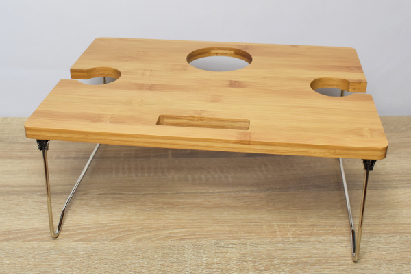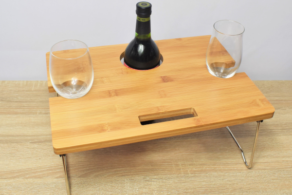 不安定な足場でもグラスとボトルをしっかりとキープしてくれる「折り畳み式 ワイン&スナックテーブル(2人用)」。家族や友人とのちょっとした食事にぜひ活用してみては?