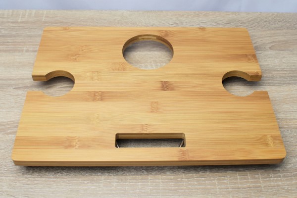 それでは実際に、ワインボトルとグラスをテーブルにセッティングしてみましょう。瓶よりも大きいサイズのスロットがボトルの転倒を防止。穴と瓶の隙間が広く設計されているので、ボトルの取り出しも非常にスムーズでした。もちろん、テーブルの広さも申し分ナシ。二人分のおつまみなら十分のせることができ、快適な“チョイ飲み”ライフを楽しめます。