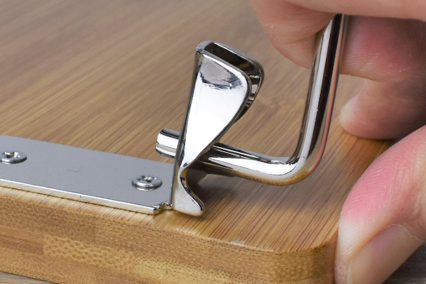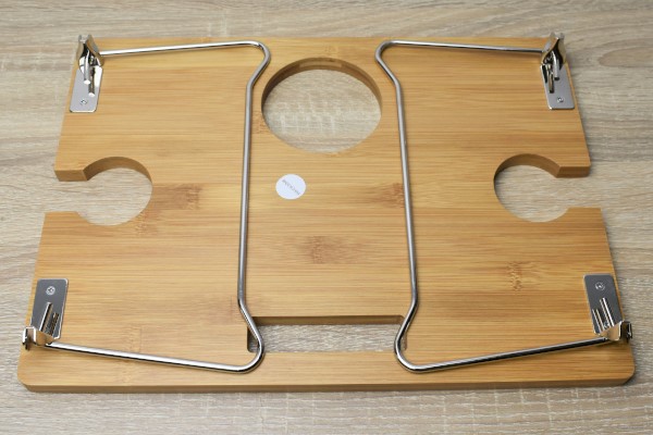 天板に空いている穴はグラスとボトルをセットできる他、“持ち手”としても便利です。試しに運んでみたところ、ワンハンドでも十分に移動可能な軽さでした。折り畳むとおよそ4.0cmほどの薄さになるため、わずかな隙間にもスッポリと収納できますよ。