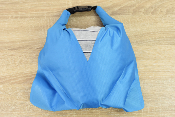 袋の口を閉じて窓のある方向に4回ほど折り込み、バックルを留めてひたすらシェイク。十分に洗った後、袋の下部にあるバルブを緩めて水を抜いてください。泡がなくなるまですすいだら、袋ごと丸め込んでしっかり脱水。水はバルブからしか出てこないので、周りを濡らしたくない場所でも安心して洗濯できます。