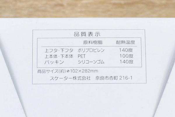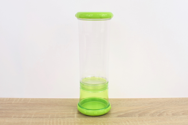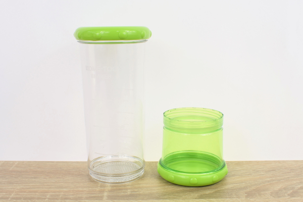 同商品は上下2つのパーツに分かれた筒状の米研ぎ器。パーツはそれぞれ長さが異なり、下パーツの大きさは上パーツの3分の1程度です。全パーツを繋げた時のサイズは約28.2(縦)×10.2cm(幅)と大きめですが、おかげで3合までの洗米が可能に。