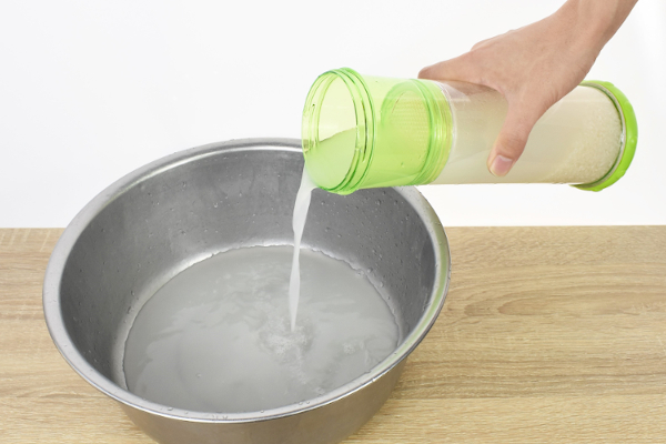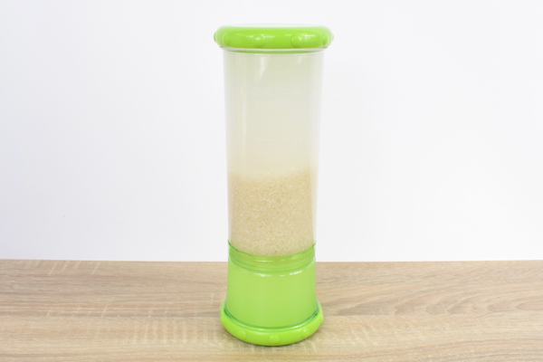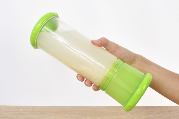 実際に米を用意して研いでいきます。上パーツのフタを外して、まずは必要な分の米と水を投入。上パーツには1合から3合までの目盛りがついているため、米の計量を間違える心配はありませんね。水を入れてフタを閉めたら軽く15~20回シェイクし、下パーツのフタを外して排水します。普通なら米が流れないように手で押さえるところですが、同商品はザルのような網目が米をキャッチ。片手でも簡単に水を捨てることができます。