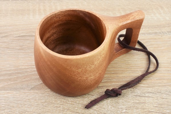 まず目を引くのは木目が美しいボディ。どこにも継ぎ目がないところをみると、1つの木材から成形されたのかもしれません。ボディは底から飲み口に向かってわずかにすぼまったタル型で、全体的に柔らかい印象を受けるデザインです。
