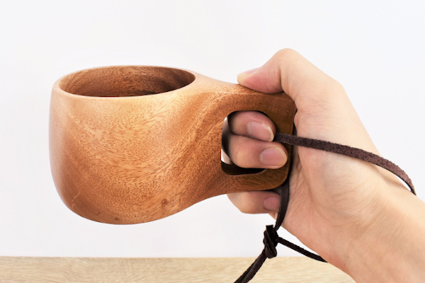 特に気に入ったのは、ボディから生えたように伸びる取っ手。普通のマグカップと比べてかなり太めですが、意外なほど持ちやすくてしっくりきます。指の触れる箇所の自然な丸みが吸いつくような感触を生み出しているのかも。また取っ手に括りつけられている革紐はデザインのアクセントになるだけではなく、腕を通しておけば落下防止のストラップとして機能します。アウトドアで使う時など、地面に落としたくないシチュエーションではうれしい気遣いですね。