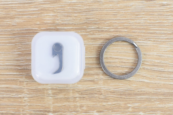 丈夫なチタニウム素材で作られた同商品。大きさは約18mmで、重さはおよそ2gほどしかありません。気になる大きさは、1円玉にスッポリと隠れてしまうほどの超ミニサイズ。あまりにも小さいので「すぐに失くしてしまうかも」と心配でしたが、キーリングがついているおかげで保管もラクチンです。