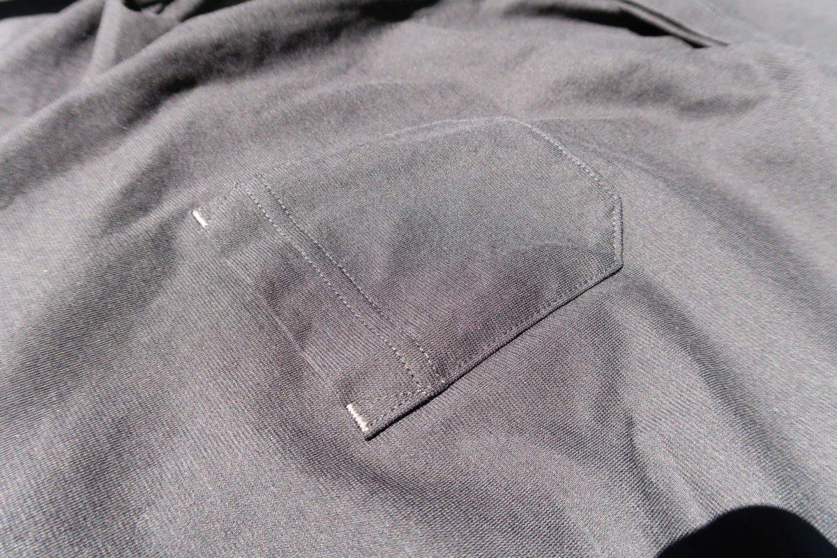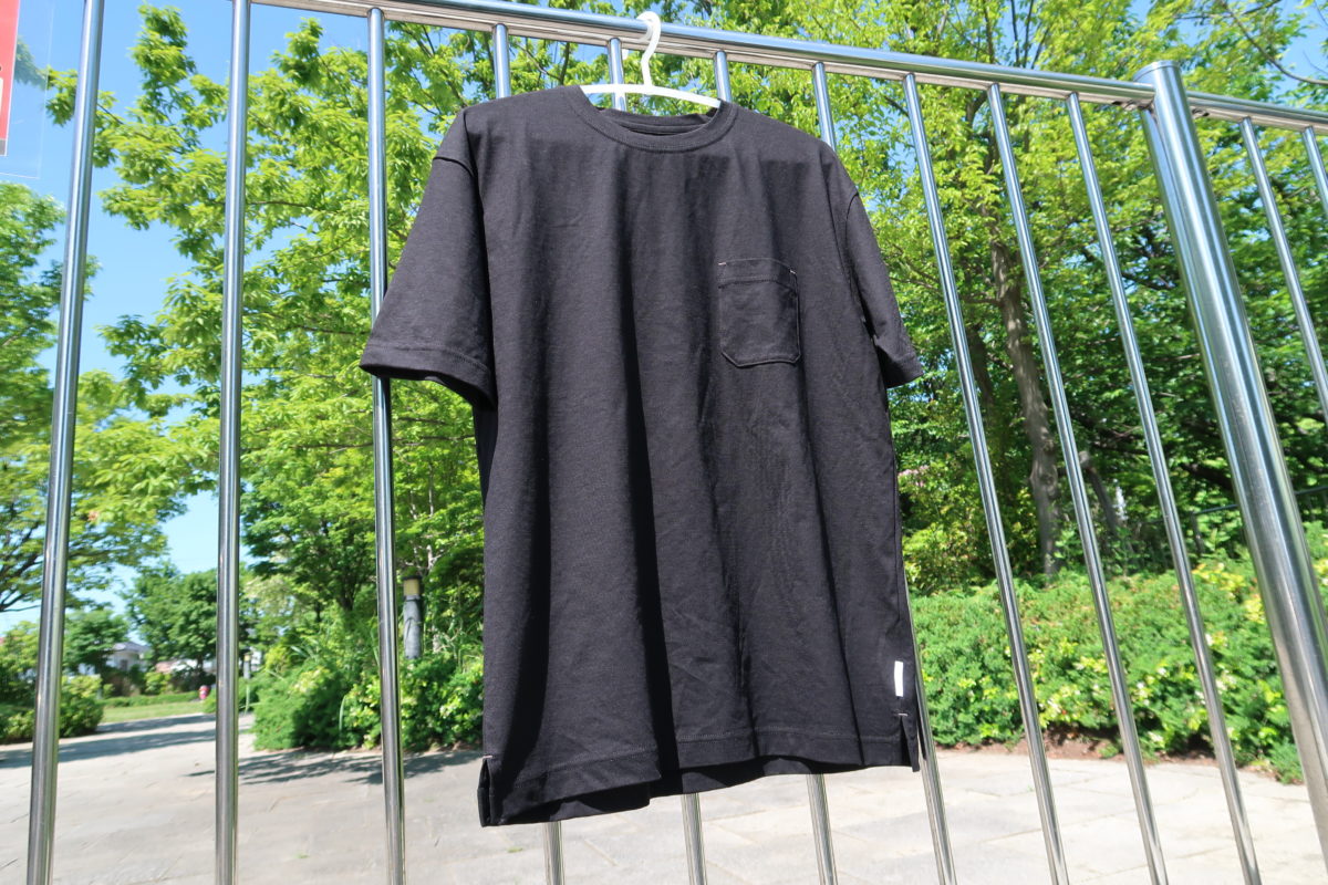 まずは第一印象のデザインから。シンプルな無地タイプで、ボックス形状。着やすいビッグシルエットとなっており、左胸にポケットが一つ付いているポケットTシャツです。一般的に4つのパーツで構成されるTシャツを、前身頃と後身頃の2つのパーツにだけに減らすことで、袖の縫い目を最大限に減らしています。