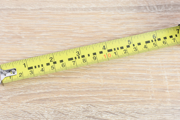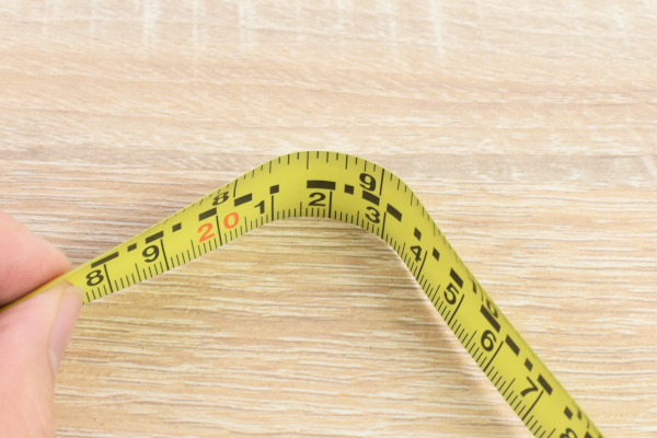 まずは普通のメジャーと同じようにテープを伸ばしてアイテムの長さを測定。テープは柔らかく扱いやすい素材でできており、段ボールやテーブルといった角張った物でも計測はラクチンです。測定した長さはデジタル画面から確認可能。これなら見間違いなく、正確な長さを測ることができますね。