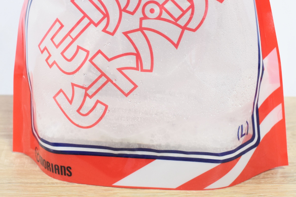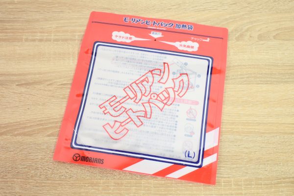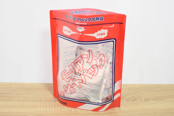 “加熱袋”と“発熱材”がセットになった同商品。袋の大きさは約30(縦)×27cm(横)ほどで、入り口にはチャックがついています。公式サイトによれば、発熱材から発生する水蒸気を利用して食材を加熱調理できるとのこと。さっそく試しにレトルト食品を加熱してみましょう。