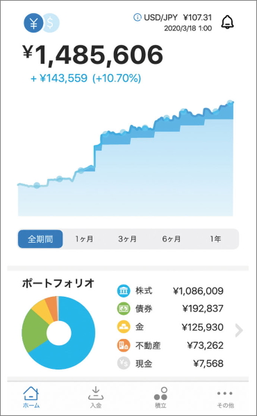 預かり資産・運用者数No.1の投資一任型ロボアドバイザー。WealthNaviの専用口座は10万円から投資をはじめられ、その後は毎月1万円から積立投資が可能。SBI証券など、様々な金融機関向けにサービスの提供も行っています。