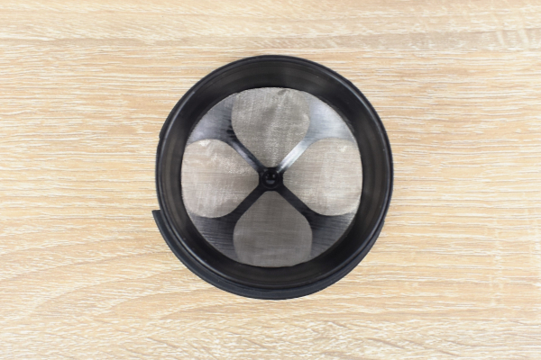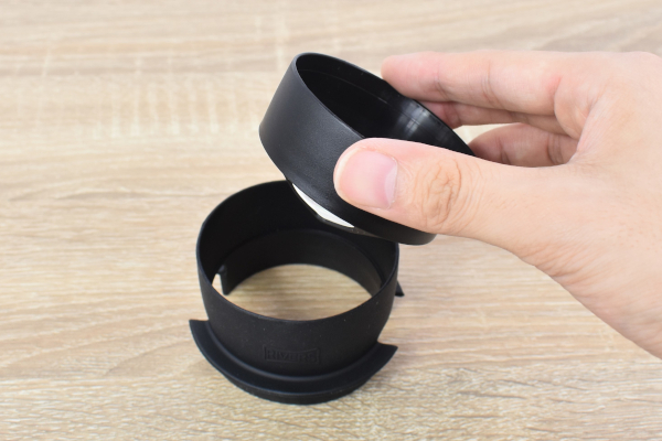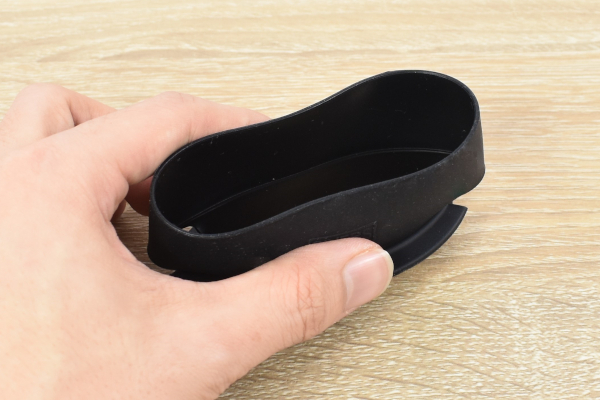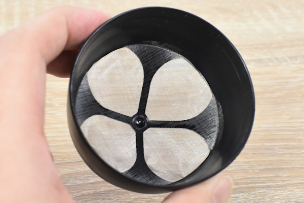 ポリプロピレン製の本体と、シリコーンゴム素材のホルダーがセットになった同商品。肝心のフィルターは網目の細かいステンレスでできており、紙フィルターを使うことなくコーヒーを抽出できます。ホルダーの直径を測ってみたところ、8cmとかなりコンパクト。素材がやわらかいため、折り畳んでマグカップの中に収納しておけるのもありがたいですね。