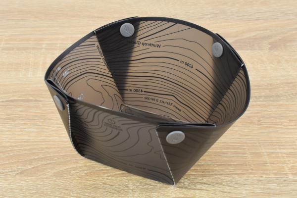 大きさの異なる半透明のプレートが3枚セットになった同商品。よく見ると等高線や地名が描かれた登山地図柄になっています。