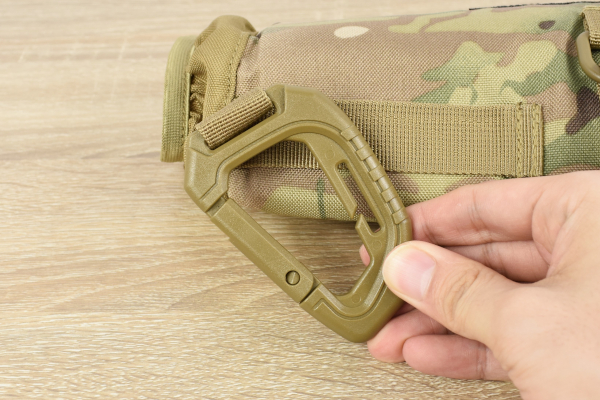 同商品は、“マルチカモ”と呼ばれるシックなカモフラージュ柄のペットボトルホルダー。大きなタクティカルカラビナとベルトループがついていて、リュックの太いベルトにも簡単に引っ掛けられます。