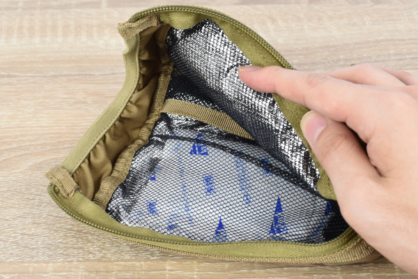 正面のジッパーを開けると、中には保冷剤を入れておけるメッシュポケットが。大きめの保冷剤も余裕で入るため、暑い日でも安心です。
