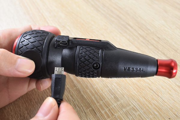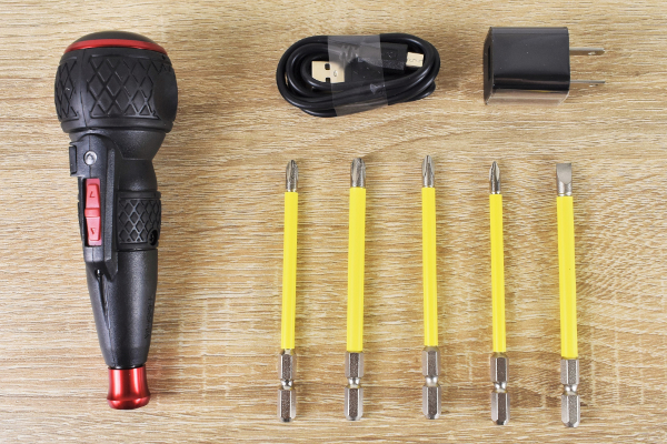 パッケージの中には付属品として、5種類の“ビット”や“USB充電ケーブル”などが入っていました。ちなみに本体を約1時間充電すると、およそ40分ほど稼働する仕組みです。実際に使用する際は、バッテリーのチャージをお忘れなく。