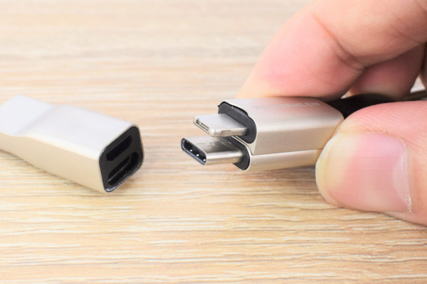 両端を持って引っ張ると、真ん中から2つのコネクタが登場。1つはUSB-C、もう1つはLightningとマイクロUSBが一体化した2way仕様のコネクタでした。外した方のパーツは、先端がUSB-Aになっています。どちらかのコネクタをUSB-Aに差し込めば、もう片方のコネクタで充電ができるという仕組みですね。
