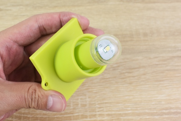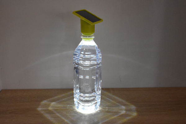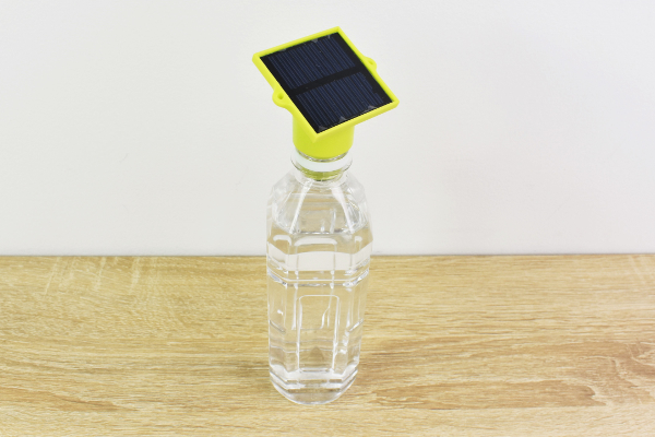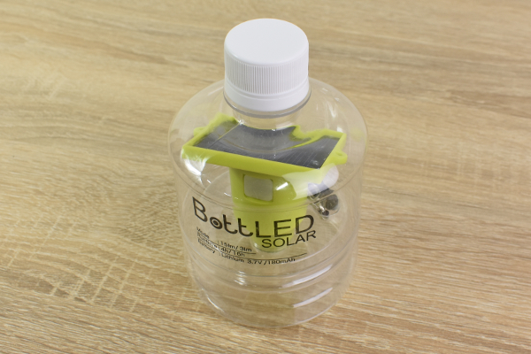 ボトル型パッケージの中には、黄緑色のソーラーパネルつきライトが入っています。使い方は、まずパネルの下にあるライト部分を“水入りペットボトル”の口に差し込むだけ。ソーラーパネルで充電した後、スイッチを押せばライトが点灯する仕組みです。