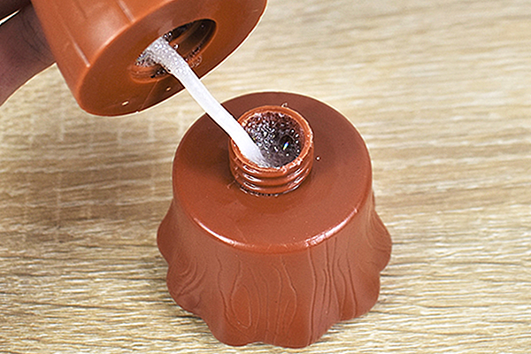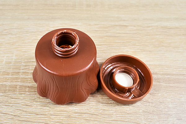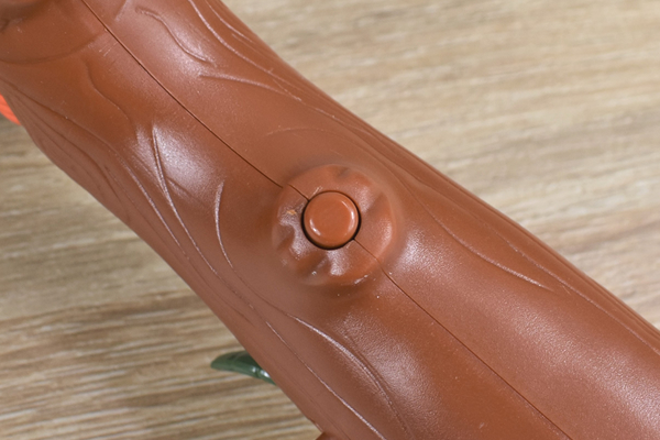 85(横)×115(縦)315mm(高さ)ほどの大きさで、なかなか存在感のある同商品。木の枝にオレンジのくちばしの鳥・オオハシが留まっています。まずは木の根元にシャボン液のタンクをセットし、枝のスイッチをシャボン玉モードに切り替えて遊ぶことに。