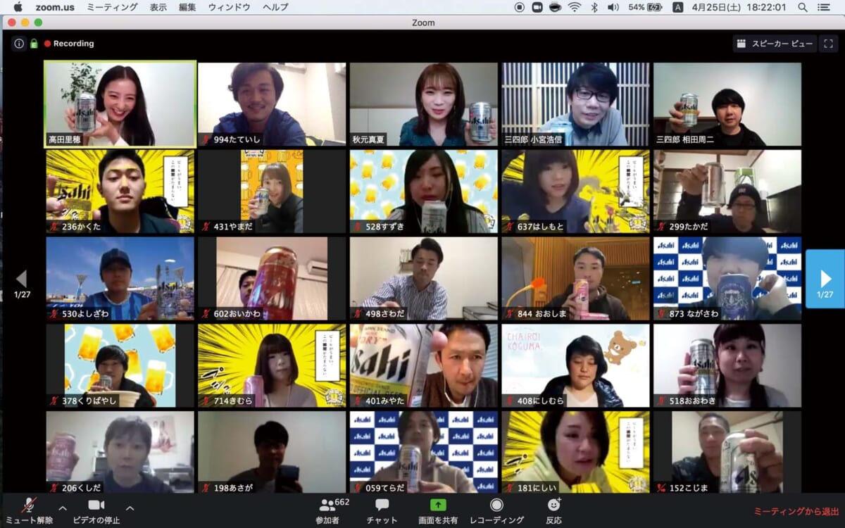 アサヒビールが主催する、数百~1000人限定のオンライン飲み会イベント。人気アイドルやお笑い芸人など有名人のトークを中心に繰り広げられ、これまでに数回実施。