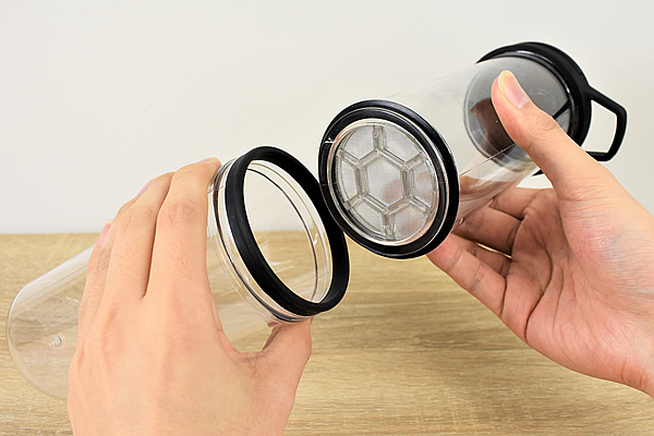 ボトルの大きさは約97(奥行き)×76(幅)×198mm(高さ)ほど。豆を入れる外側の容器と、抽出したコーヒーが貯まる内側の容器でセパレートされているのが最大の特徴です。