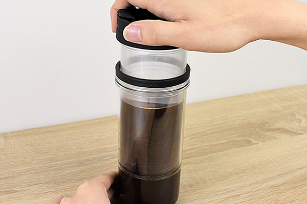 コーヒーのこうばしい香りが漂い始めたら、内側の容器をボトルの底まで押し込みます。するとフィルターを通して、コーヒーが抽出されてきました。飲み口から直接コーヒーを飲めるので、わざわざコップに移し替える必要がありません。豆の美味しさを活かした本格的なコーヒーを気軽に味わえますよ。