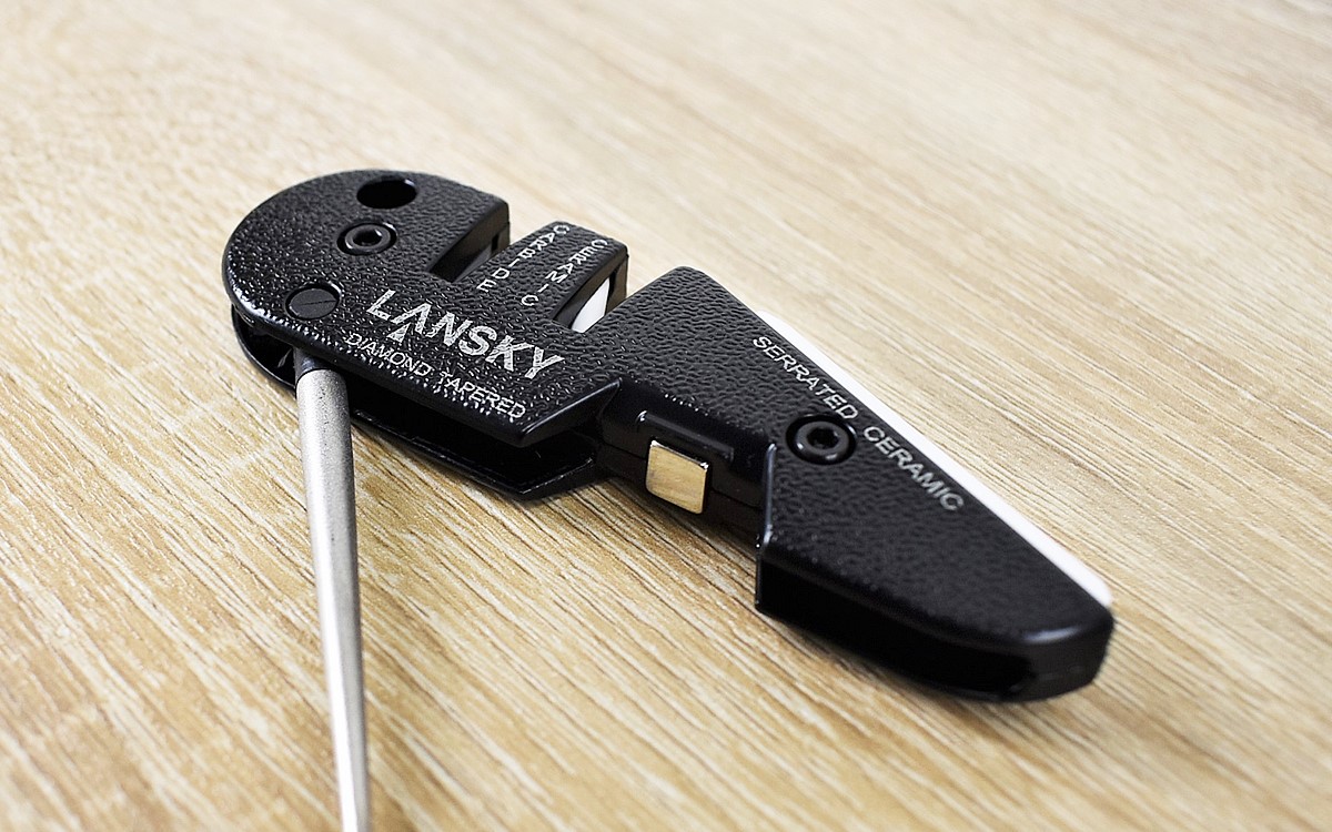 使い方はナイフを“タングステンカーバイド”にセットし、刃を3~4回ほどスライドさせるだけ。2つの石が刃を左右から磨いてくれるおかげで、簡単に研ぎ作業が完了しました。仕上げ研ぎに適した“セラミックシャープニングロッド”もついているため、ツヤのあるきれいなナイフに仕上げることができますよ。