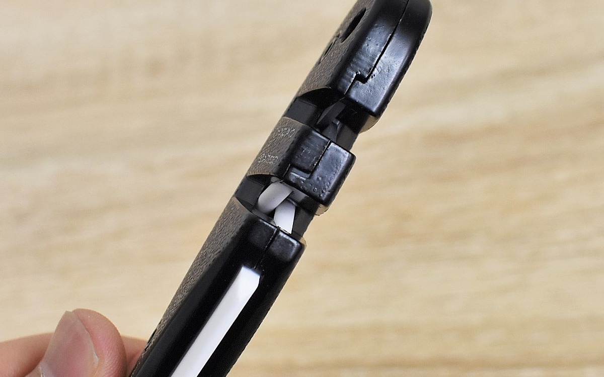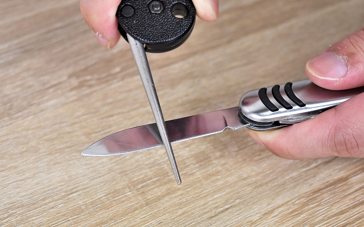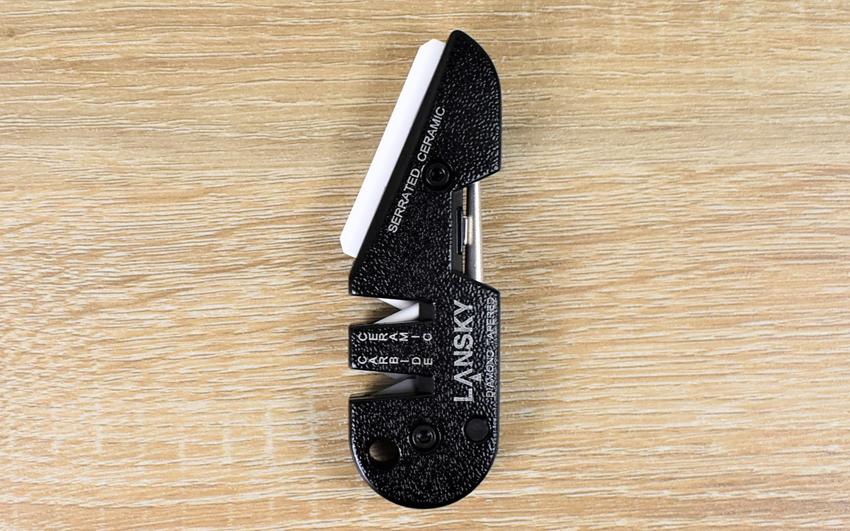 本体の大きさは約10(幅)×3.3(奥行き)×1.3cm(高さ)ほどで、重さは大体105g程度。ポケットに入れても邪魔にならないサイズ感です。小さな本体にはタングステンカーバイドや波刃シャープナーなど全4種類の研ぎ石がついており、様々なナイフのメンテナンスが可能。それでは実際にナイフを研いで、使い心地を確かめてみましょう。