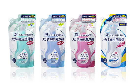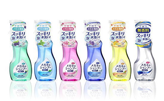 メガネのシャンプー 除菌EXは、洗浄時にほのかに香る「ミンティベリー」「アクアミント」「フローラル」「フレッシュムスク」「トロピカルスウィート」の5つの香りと、香りの苦手な方に向けた「無香料」の6種類をラインナップ。気分に応じて好きなアイテムを選ぶことができます。また、リピーターの方に便利な、省資源化とゴミ削減に配慮したつめかえ用「ミンティベリー」「アクアミント」「フローラル」「無香料」も発売中です。