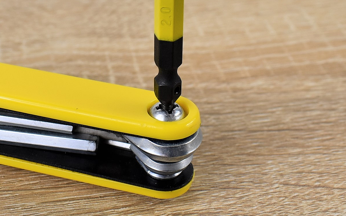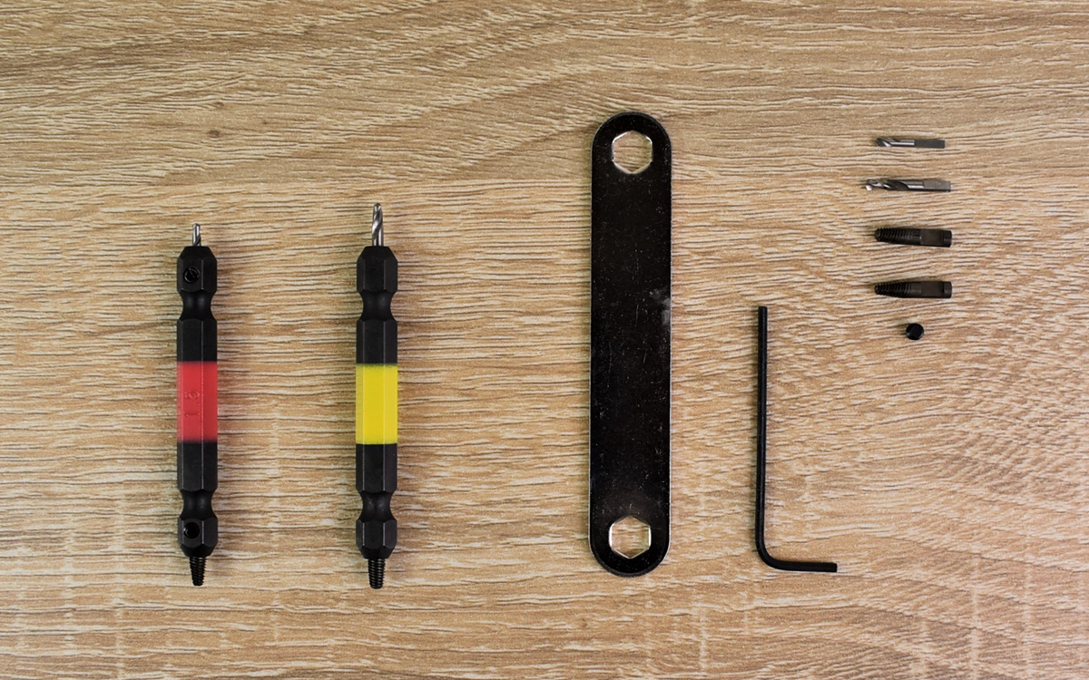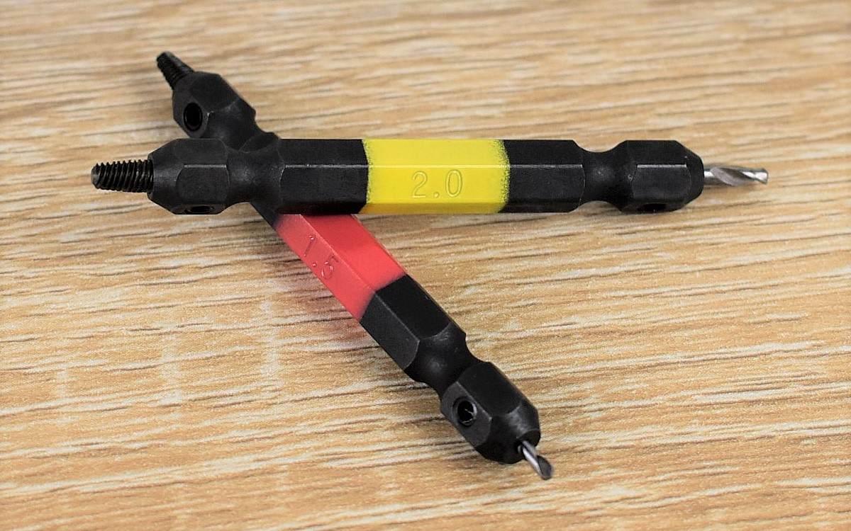 赤と黄色の“ビット”と呼ばれるパーツに、六角L型レンチや板スパナなどがセットになった同商品。2本のビットはそれぞれ異なる大きさのネジに対応しており、ビットの片側がドリル、反対側がネジの形になっています。
