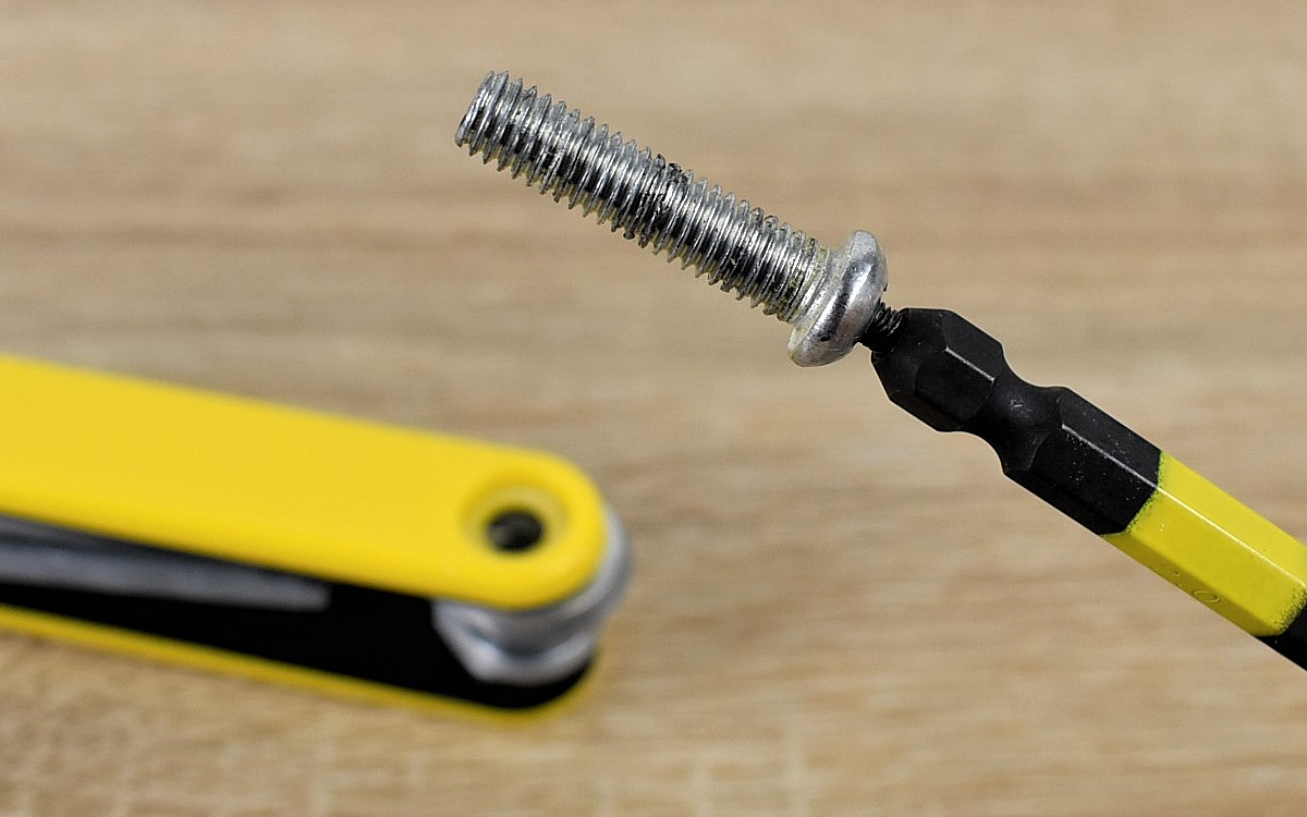 続いてビットをネジ側に入れ替え、下穴に食い込ませるように回転。外れないことを確認してから反対側に回すと、ネジがビットと共に回転してきれいに引き抜けました。ネジがビットから引き抜けないときは、付属の板スパナを使えば簡単に外せますよ。