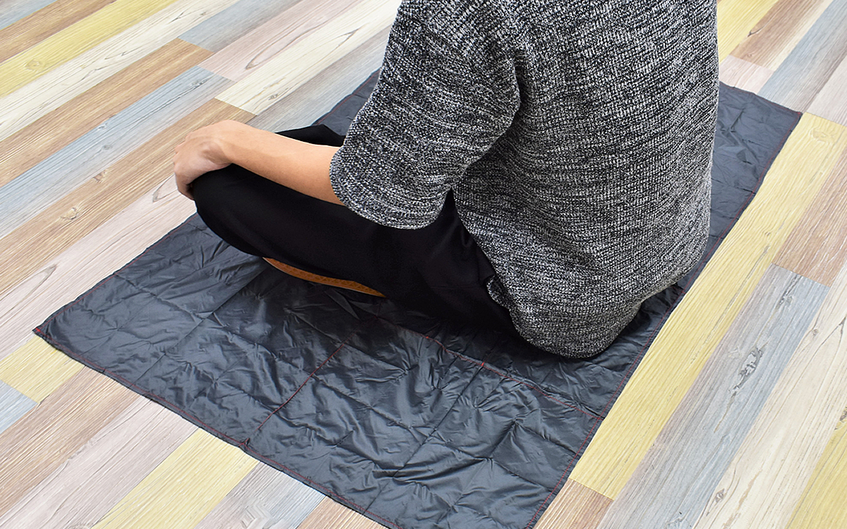 試しに座ってみたところ、1人で利用するにはちょうどいいサイズ感。荷物を置くスペースもしっかりと確保できるので、食事も快適に楽しめます。またマントのように羽織ったり荷物を包みこめば雨よけとしても活躍。急な小雨から体や荷物を守りたい時にも便利ですね。